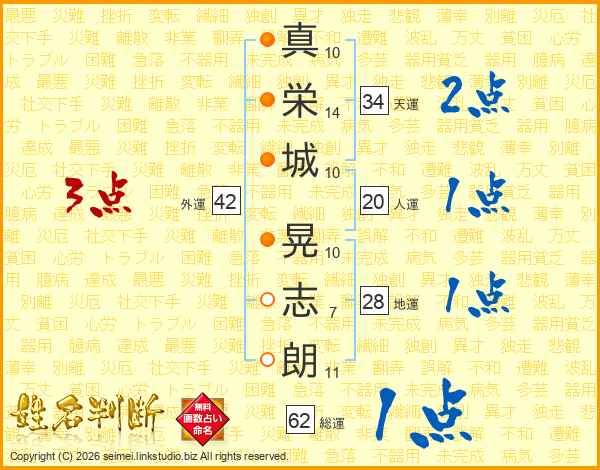 真(10画)栄(14画)城(10画) 晃(10画)志(7画)朗(11画)