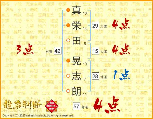 真(10画)栄(14画)田(5画) 晃(10画)志(7画)朗(11画)