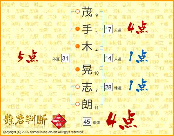 茂(9画)手(4画)木(4画) 晃(10画)志(7画)朗(11画)