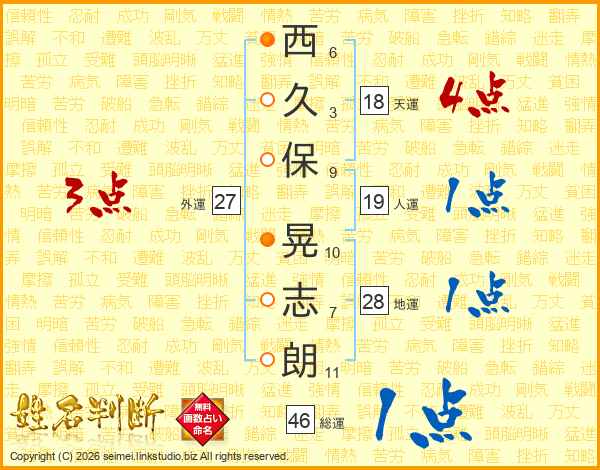 西(6画)久(3画)保(9画) 晃(10画)志(7画)朗(11画)