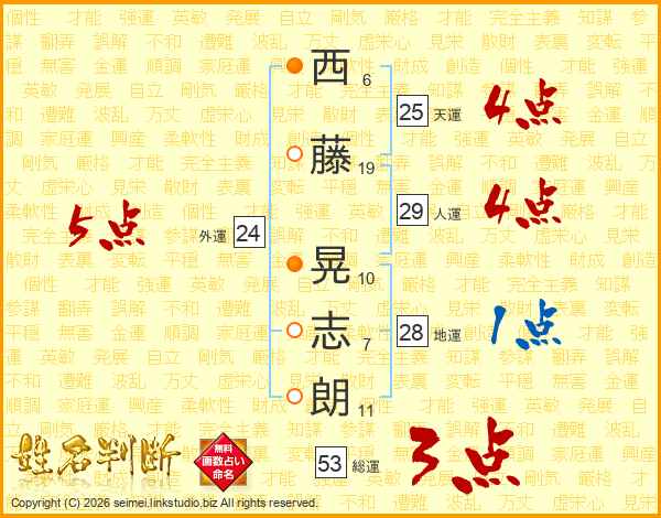 西(6画)藤(19画) 晃(10画)志(7画)朗(11画)