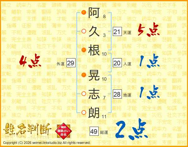 阿久根晃志朗さんの天運は21画の5点!