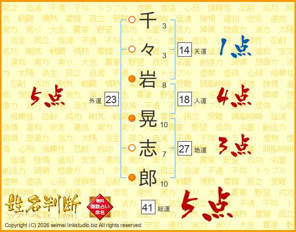 千(3画)々(3画)岩(8画) 晃(10画)志(7画)郎(10画)