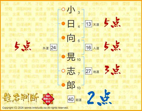 小(3画)日(4画)向(6画) 晃(10画)志(7画)郎(10画)