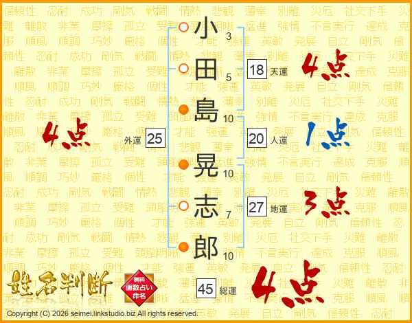 小(3画)田(5画)島(10画) 晃(10画)志(7画)郎(10画)
