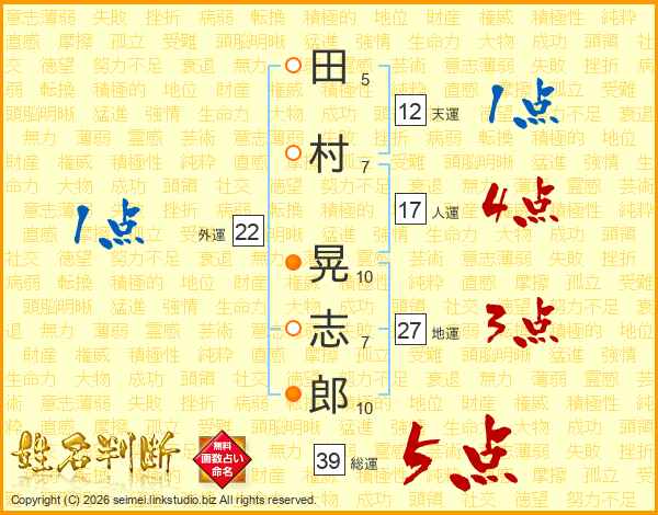田(5画)村(7画) 晃(10画)志(7画)郎(10画)