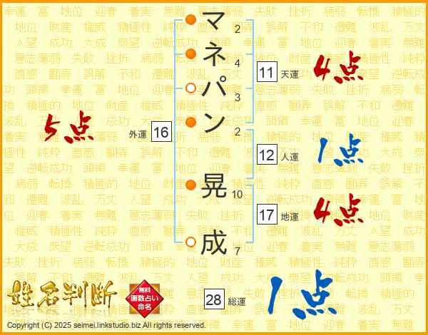 マ(2画)ネ(4画)パ(3画)ン(2画) 晃(10画)成(7画)