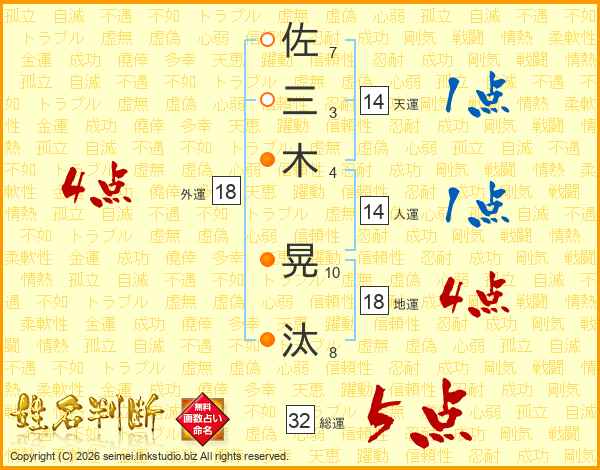 佐(7画)三(3画)木(4画) 晃(10画)汰(8画)