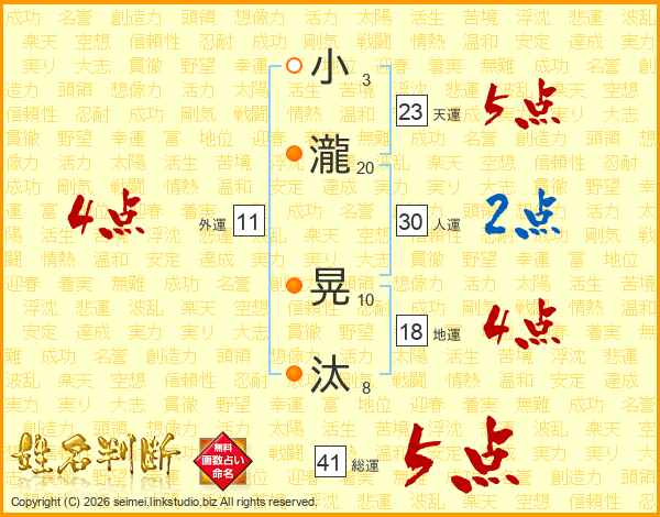 小(3画)瀧(20画) 晃(10画)汰(8画)