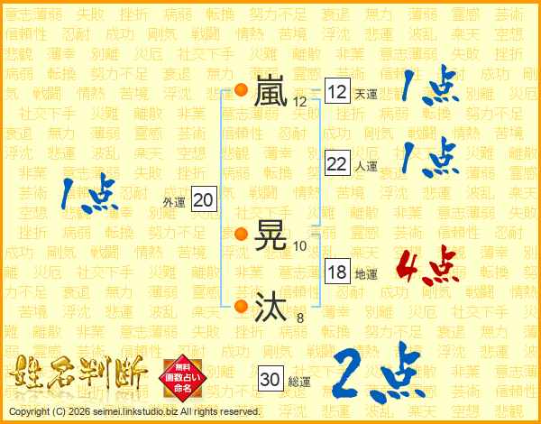 生活面を象徴する運勢です。外部から受ける影響力を表し、結婚運、家庭運や職場、環境への順応性を表します。総運から人運を引いた画数。姓や名が1文字の場合を除く。