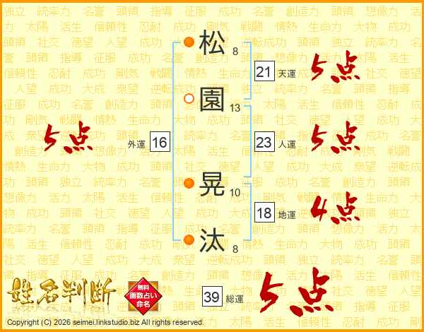 松(8画)園(13画) 晃(10画)汰(8画)