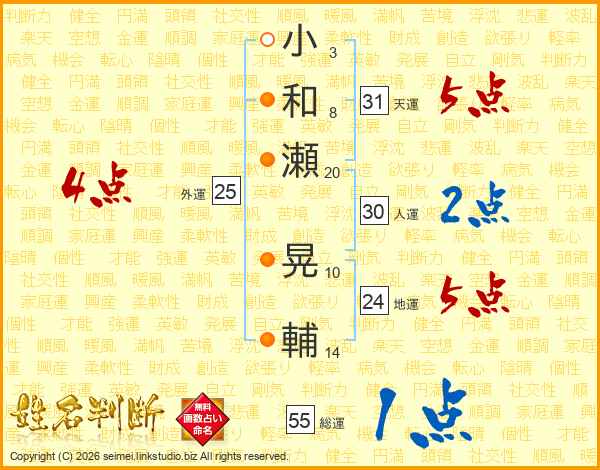 小(3画)和(8画)瀬(20画) 晃(10画)輔(14画)