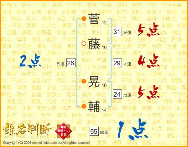 菅(12画)藤(19画) 晃(10画)輔(14画)