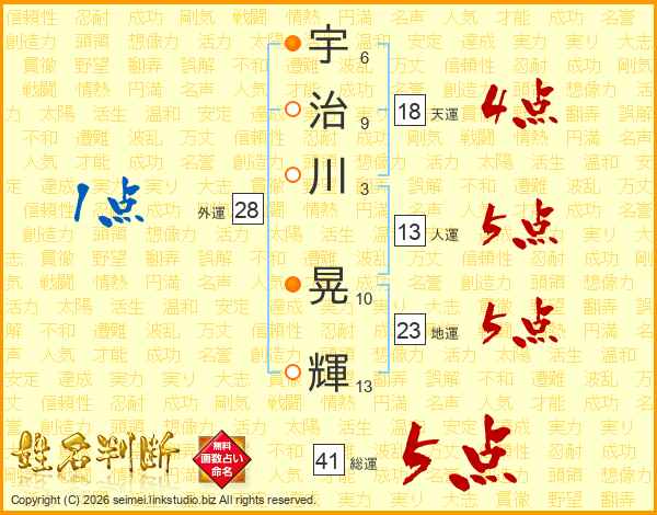 宇治川晃輝さんの総運は41画の5点!