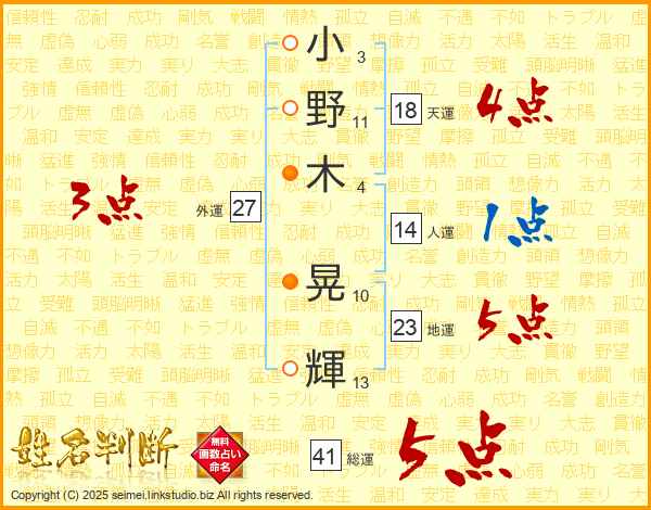 小(3画)野(11画)木(4画) 晃(10画)輝(13画)