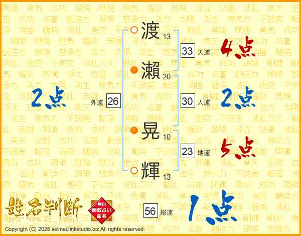 渡(13画)瀨(20画) 晃(10画)輝(13画)