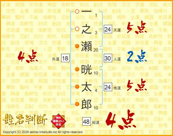 一(1画)之(3画)瀬(20画) 晄(10画)太(4画)郎(10画)