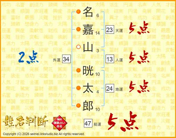 名(6画)嘉(14画)山(3画) 晄(10画)太(4画)郎(10画)