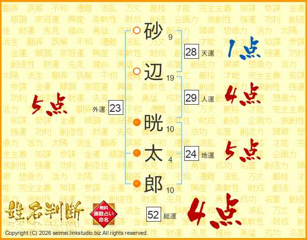 砂(9画)辺(19画) 晄(10画)太(4画)郎(10画)