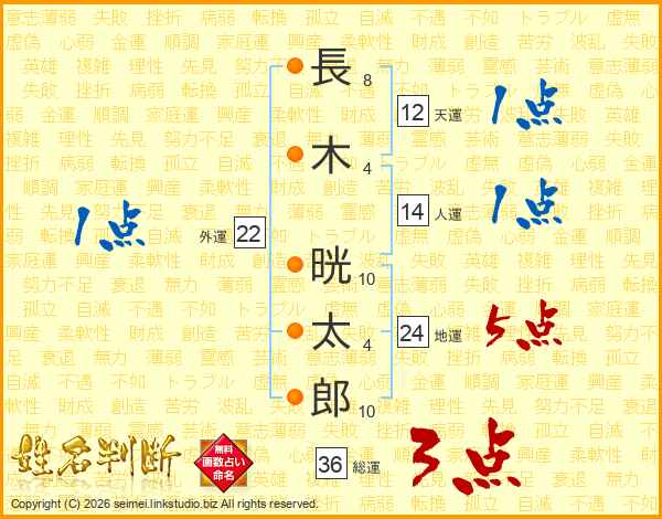 長(8画)木(4画) 晄(10画)太(4画)郎(10画)