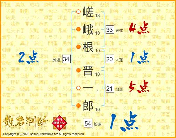 嵯(13画)峨(10画)根(10画) 晋(10画)一(1画)郎(10画)