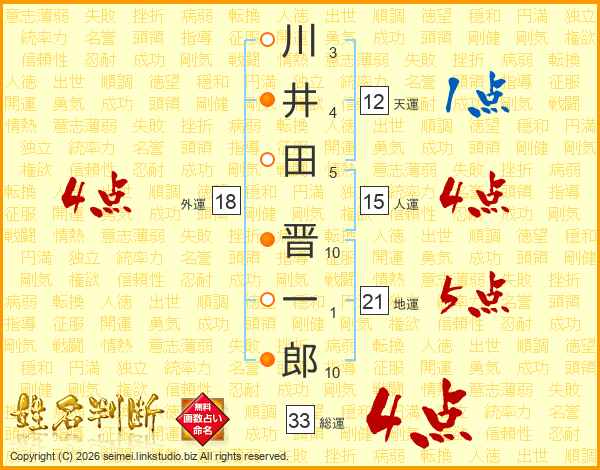 川(3画)井(4画)田(5画) 晋(10画)一(1画)郎(10画)