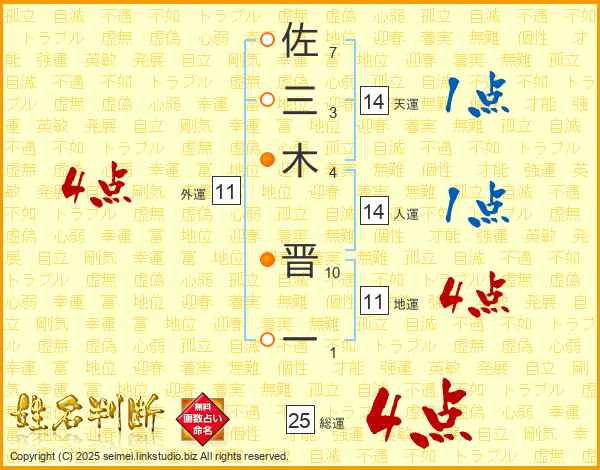 佐(7画)三(3画)木(4画) 晋(10画)一(1画)