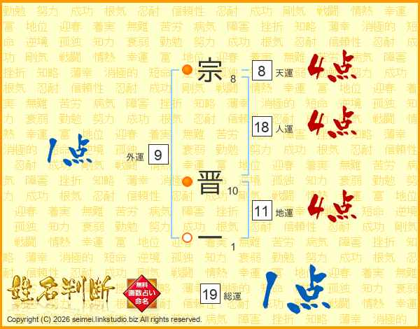 あなたの人生を表す1番重要な運勢です。生涯を通じて影響する総合運となり、主に50歳以降の晩年期に影響を及ぼします。苗字と名前の合計画数。
