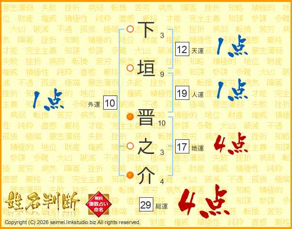 下(3画)垣(9画) 晋(10画)之(3画)介(4画)