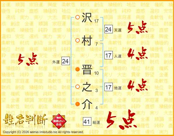 沢(17画)村(7画) 晋(10画)之(3画)介(4画)