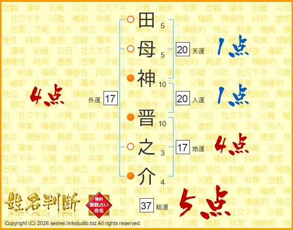 田(5画)母(5画)神(10画) 晋(10画)之(3画)介(4画)
