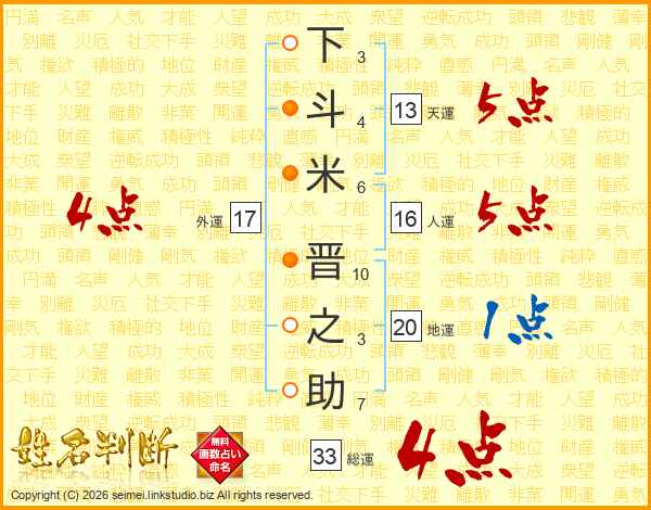下斗米晋之助さんの総運は33画の4点!