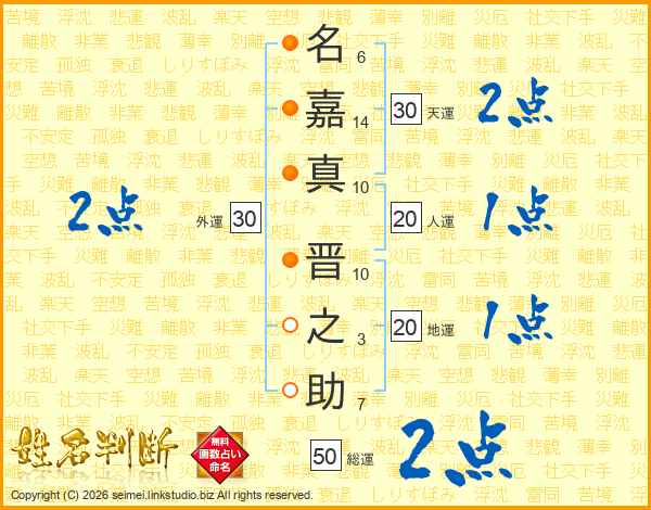 名(6画)嘉(14画)真(10画) 晋(10画)之(3画)助(7画)