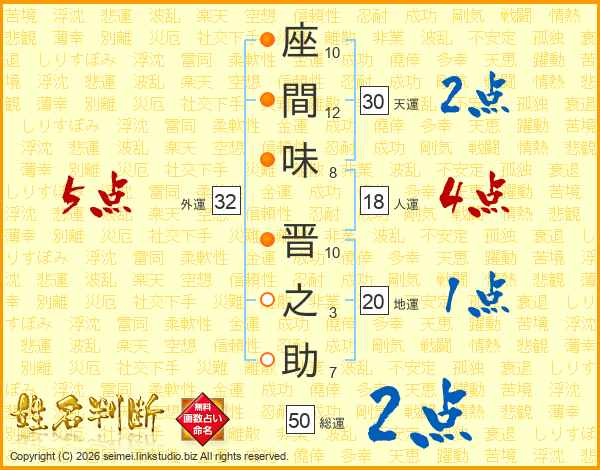 座(10画)間(12画)味(8画) 晋(10画)之(3画)助(7画)