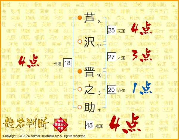 芦(8画)沢(17画) 晋(10画)之(3画)助(7画)