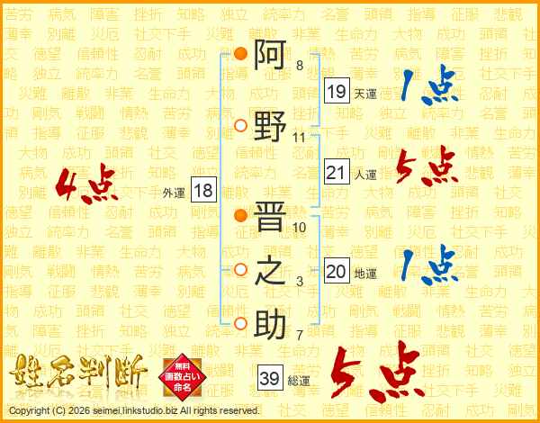 阿野晋之助さんの総運は39画の5点!