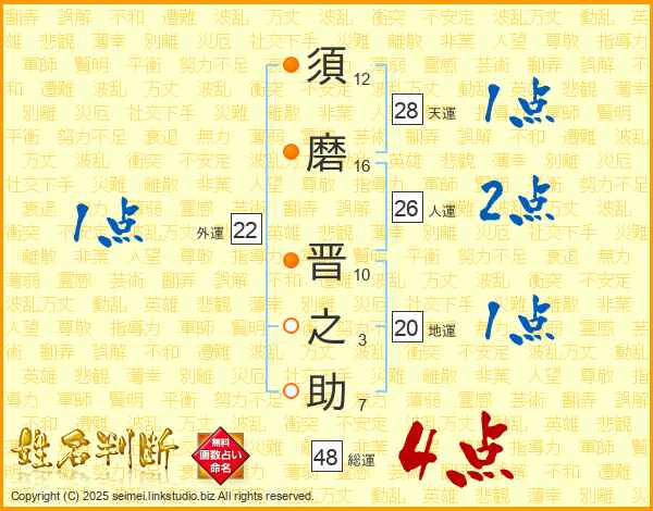 須(12画)磨(16画) 晋(10画)之(3画)助(7画)