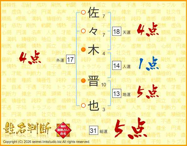 佐々木晋也さんの総運は31画の5点!