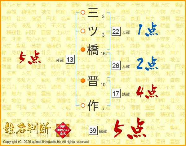 三(3画)ツ(3画)橋(16画) 晋(10画)作(7画)