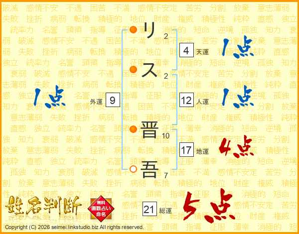 リ(2画)ス(2画) 晋(10画)吾(7画)
