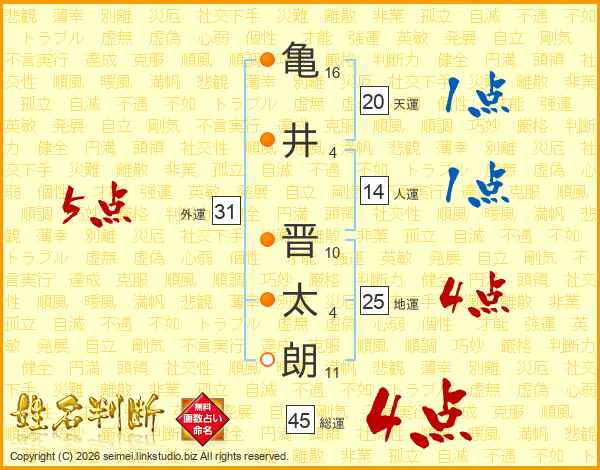 亀(16画)井(4画) 晋(10画)太(4画)朗(11画)