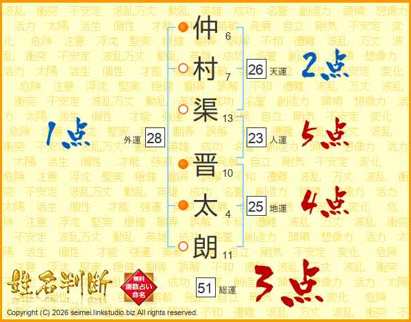 仲(6画)村(7画)渠(13画) 晋(10画)太(4画)朗(11画)