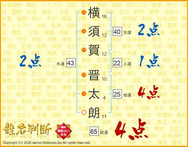 横(16画)須(12画)賀(12画) 晋(10画)太(4画)朗(11画)
