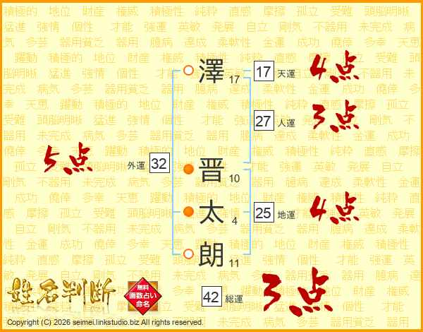 澤(17画) 晋(10画)太(4画)朗(11画)