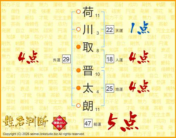 荷(11画)川(3画)取(8画) 晋(10画)太(4画)朗(11画)