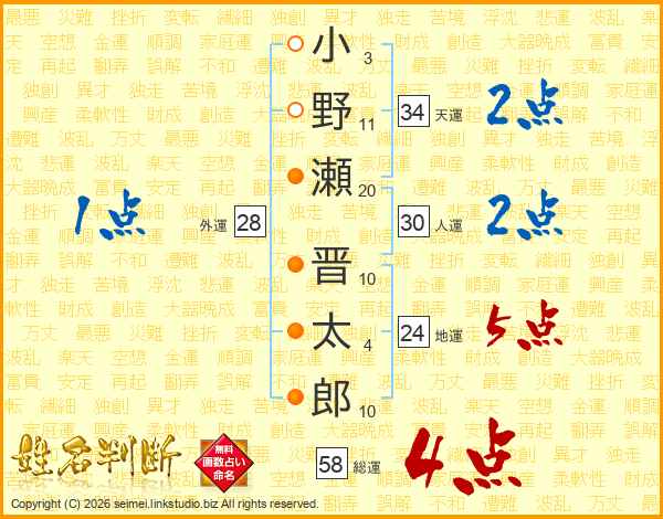小野瀬晋太郎さんの総運は58画の4点!