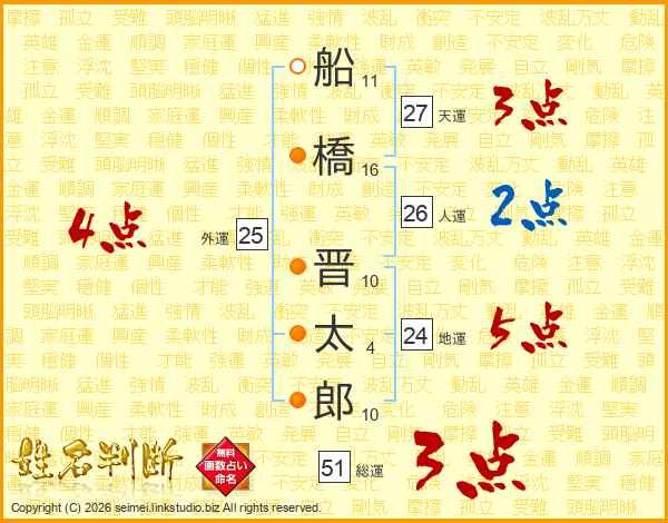 船(11画)橋(16画) 晋(10画)太(4画)郎(10画)