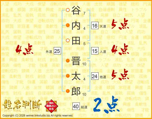 谷(7画)内(4画)田(5画) 晋(10画)太(4画)郎(10画)