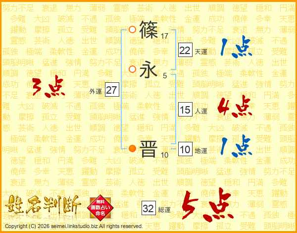 生活面を象徴する運勢です。外部から受ける影響力を表し、結婚運、家庭運や職場、環境への順応性を表します。総運から人運を引いた画数。姓や名が1文字の場合を除く。