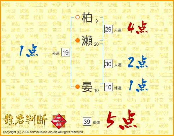 柏瀬晏さんの総運は39画の5点!